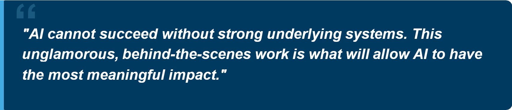You wouldn’t install a fancy hot tub on a crumbling building. In the same way, AI cannot succeed without strong underlying systems. This unglamorous “behind-the-scenes” work is often invisible and underfunded, but it’s what will allow AI to have the most meaningful impact.